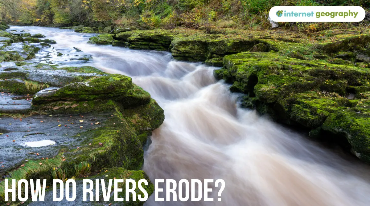 Fluvial erosion is the process by which a river wears away the land. The ability of a river to erode depends on its velocity.
